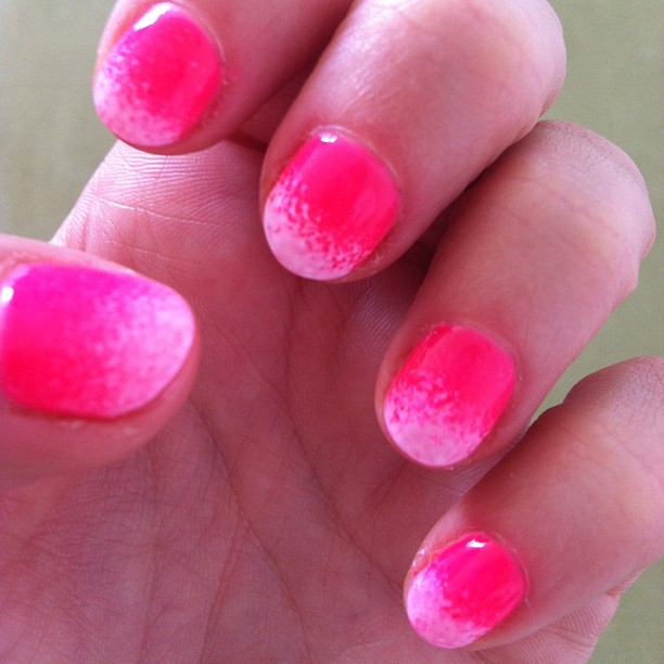 Loving the neon pink with white ombre! The neon is Jessica GELeratoin Pink Explosion, and the white is CND Shellac Cream Puff. I always love it when clients send me a pic of their nails! We rounded her nails for this which made a nice change from her usual square finish.