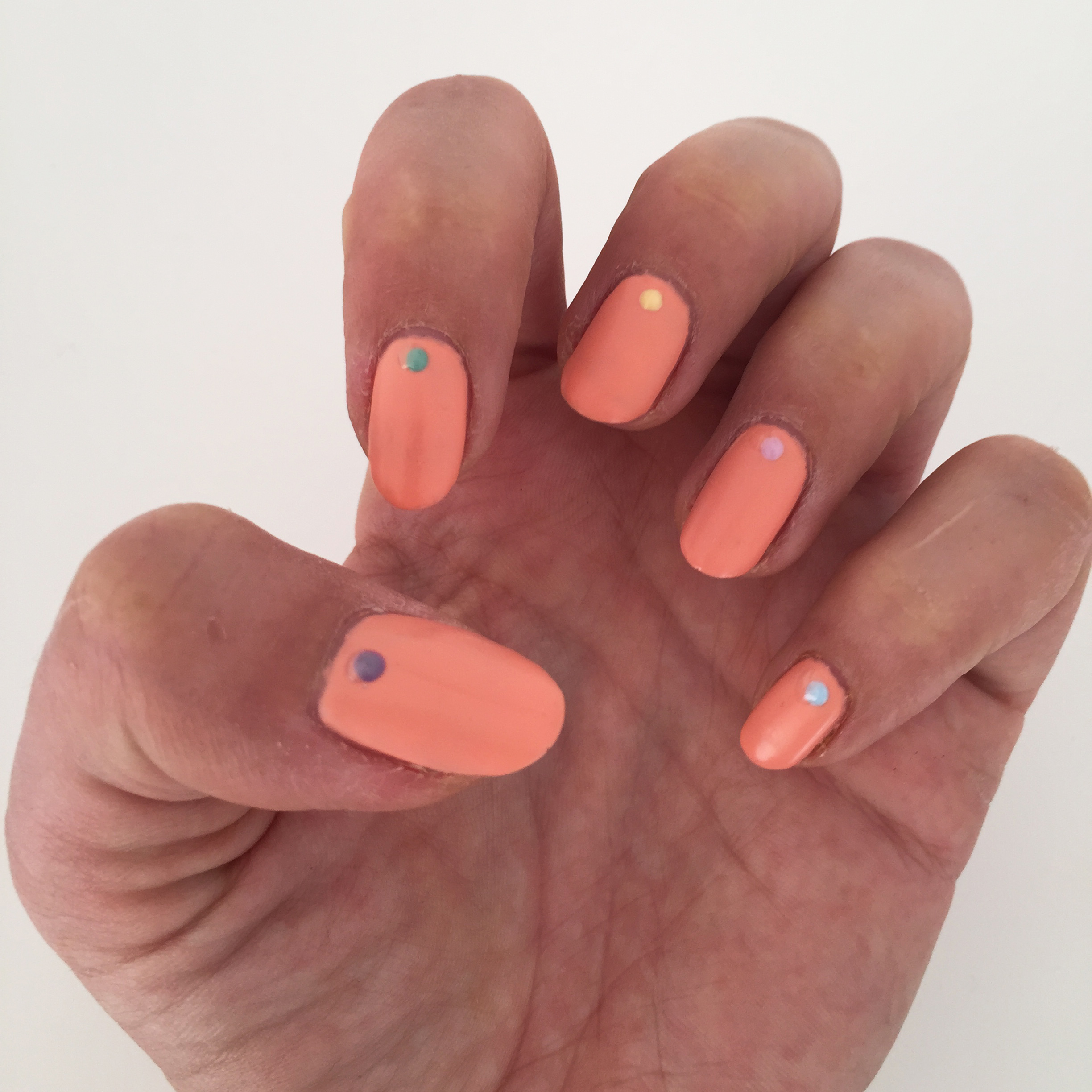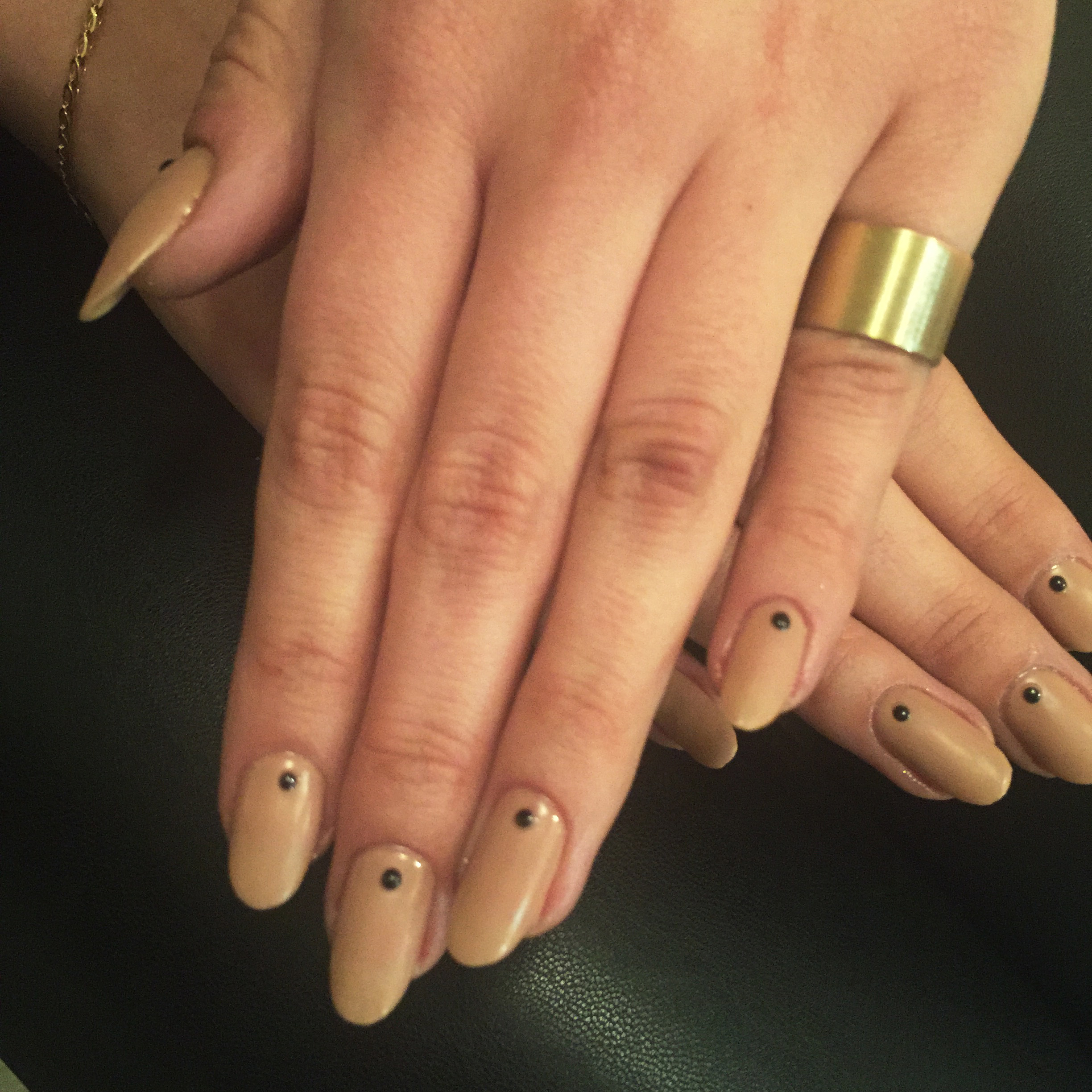 Last week was ALL about the dots, matte polish and shiny dots to be exact! It all started with Megan in Balham, she went blue with silver dots, Michelle in Finsbury Park went nude with black dots, and finally Susie went purple with yellow dots! I had gone nude with black dots, but after a very delicious (but very messy) Thai meal at the Smoking Goat in Soho, which stained my nails, I had to do them again! This time I went orange and with multicoloured dots! BTW, you have to go to the Smoking Goat, best Thai food outside of Thailand. Just make sure you’re careful with those pretty nails ladies!