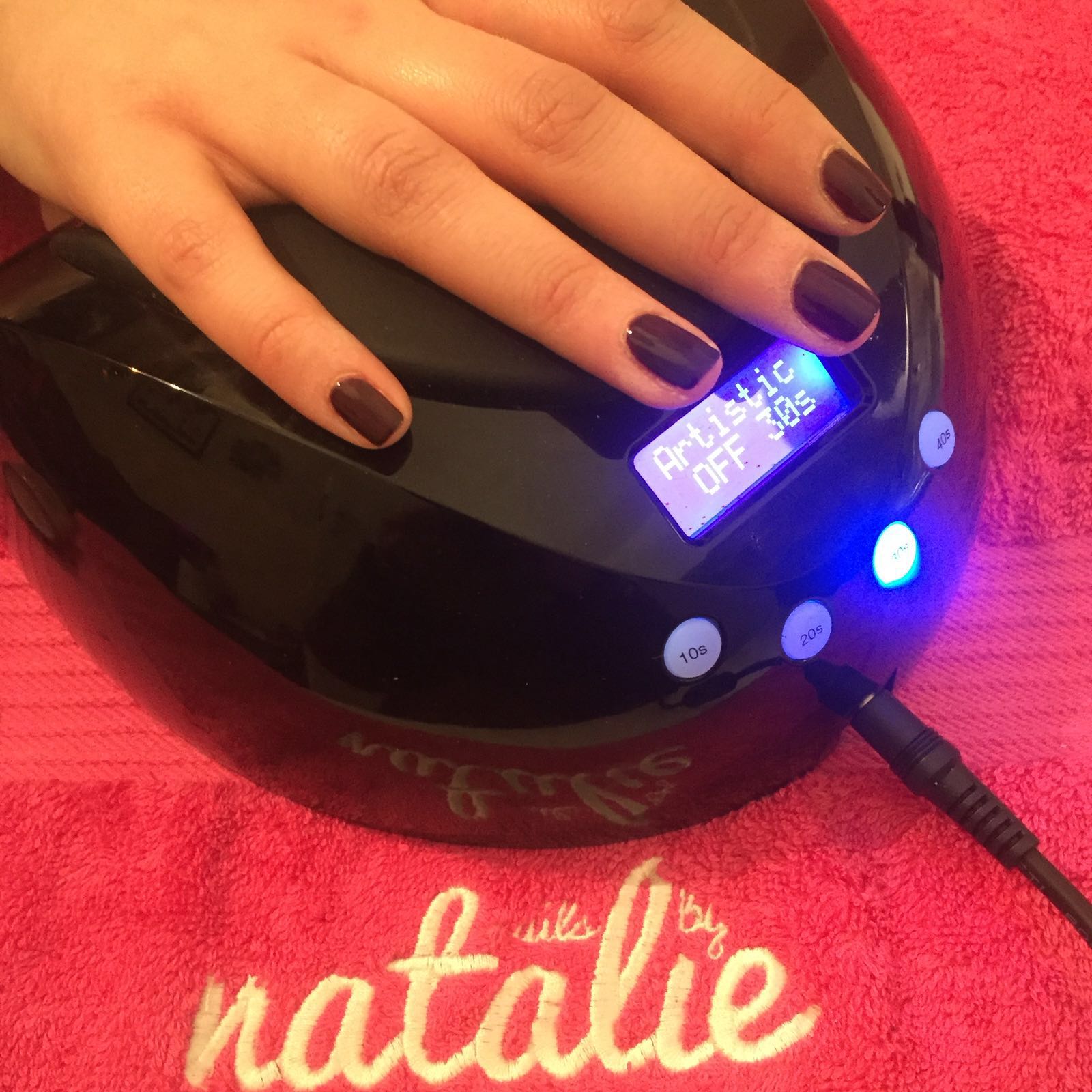 5. After that I did a french tip in Dark Dhalia, which I cured for 30 seconds and finished with a top coat.