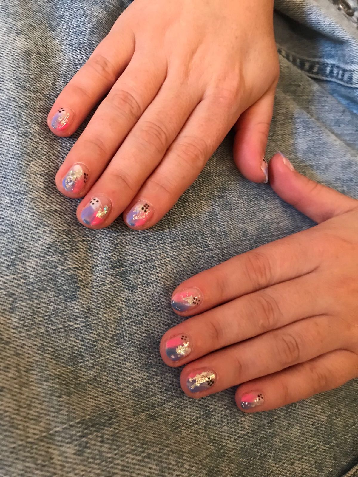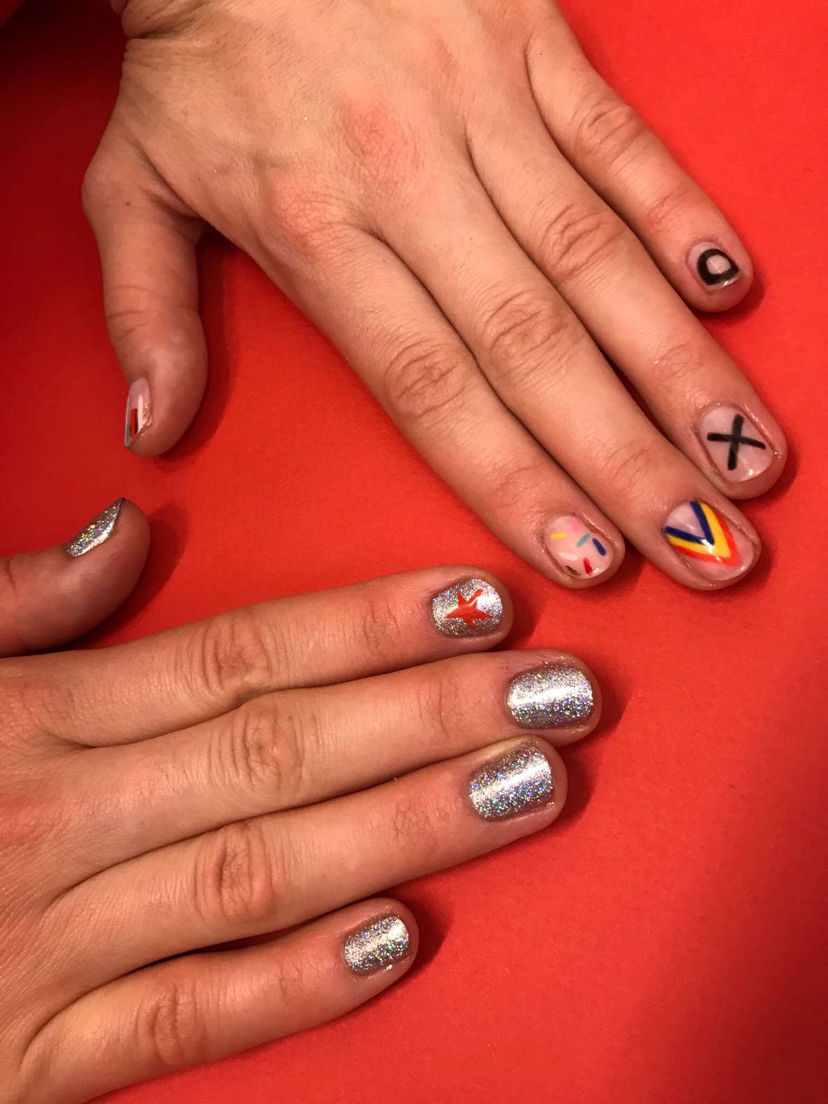 Last but by no means least, this super fun client wanted one hand sparkles and then basically said I can do whatever I want on the other hand. She likes bold designs and colour, here is what we created…